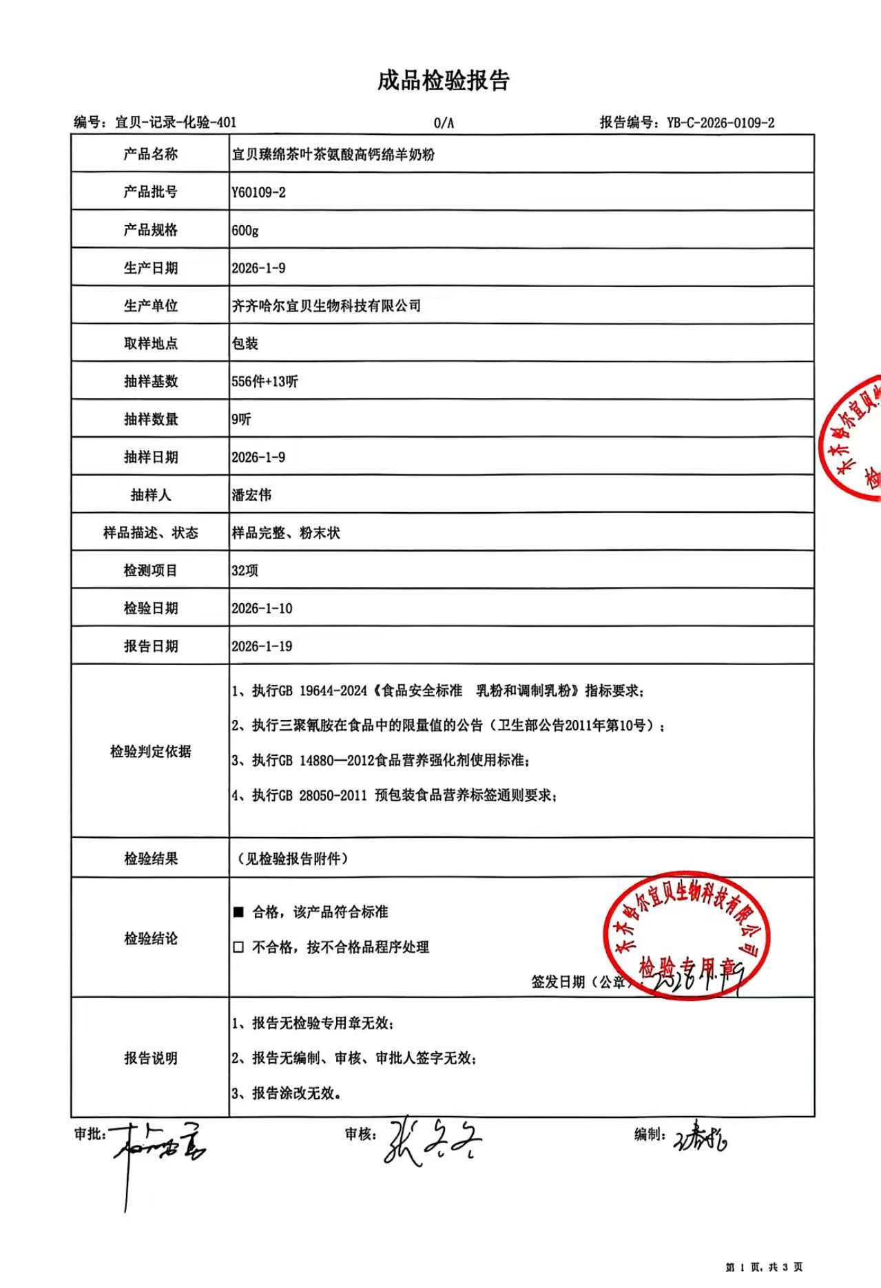 Y60109-2宜贝臻绵茶叶茶氨酸高钙绵羊奶粉600g