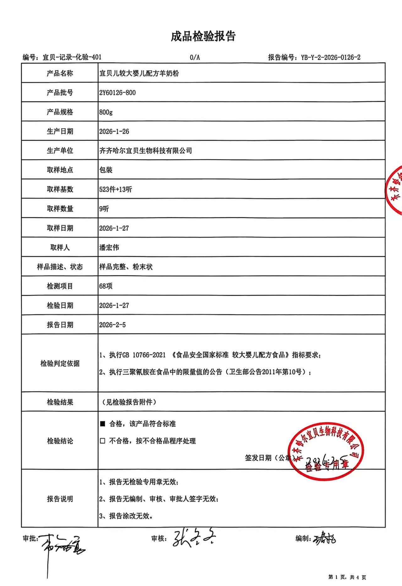 >2Y60126-800宜贝儿较大婴儿配方羊奶粉800g