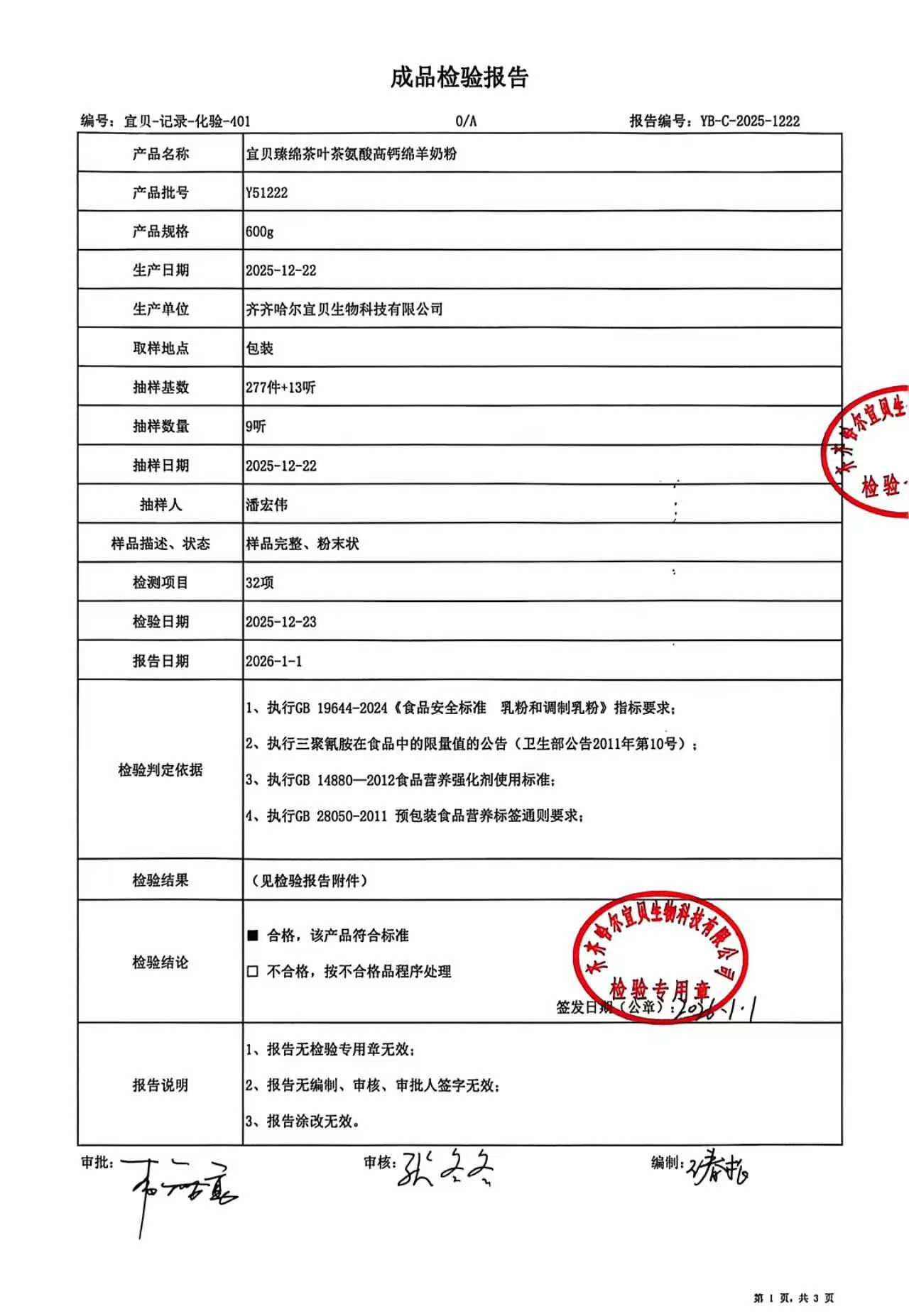 >Y51222 宜贝臻绵茶叶茶氨酸高钙绵羊奶粉600g