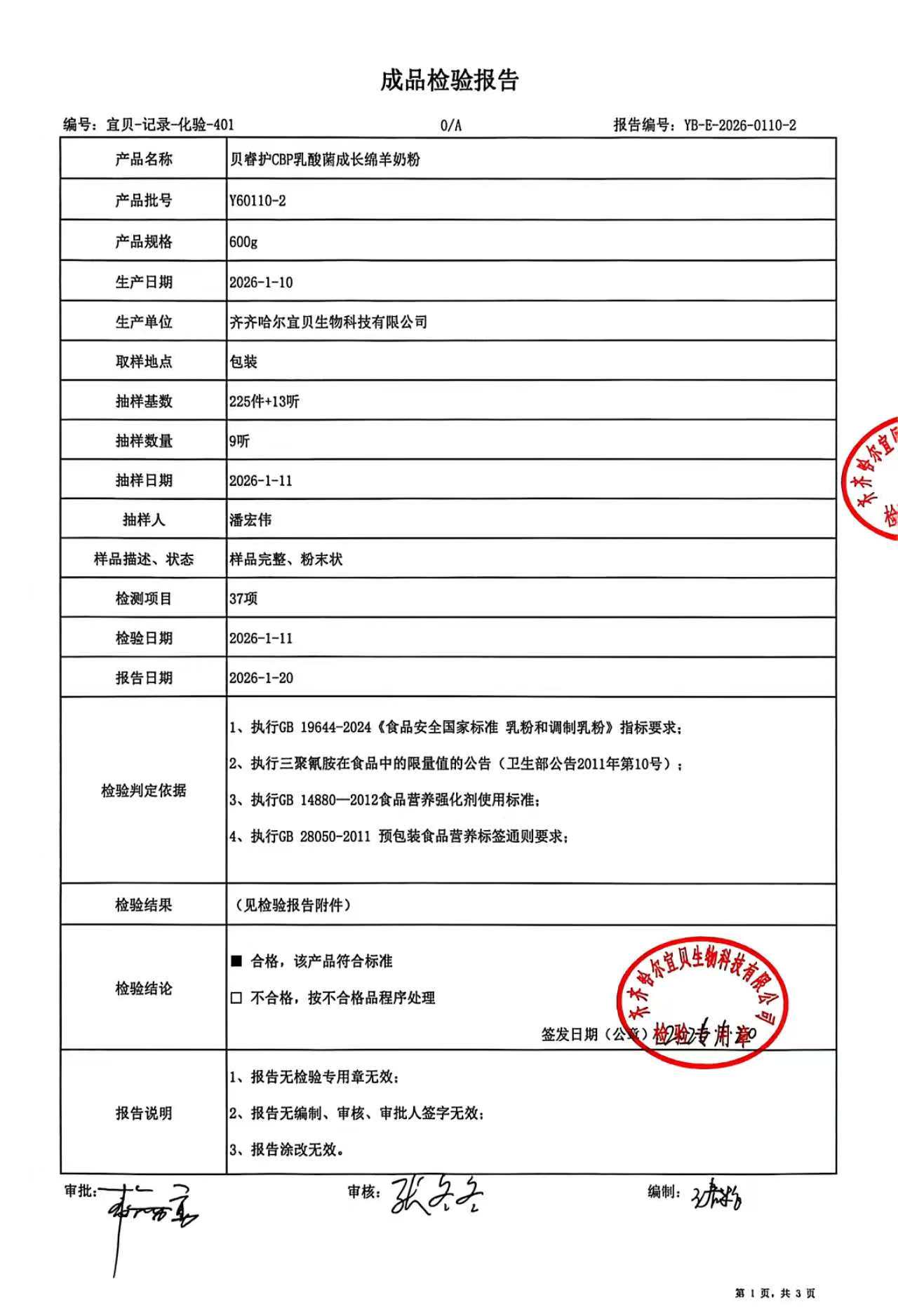 >Y60110-2贝睿护CBP乳酸菌成长绵羊奶粉600g