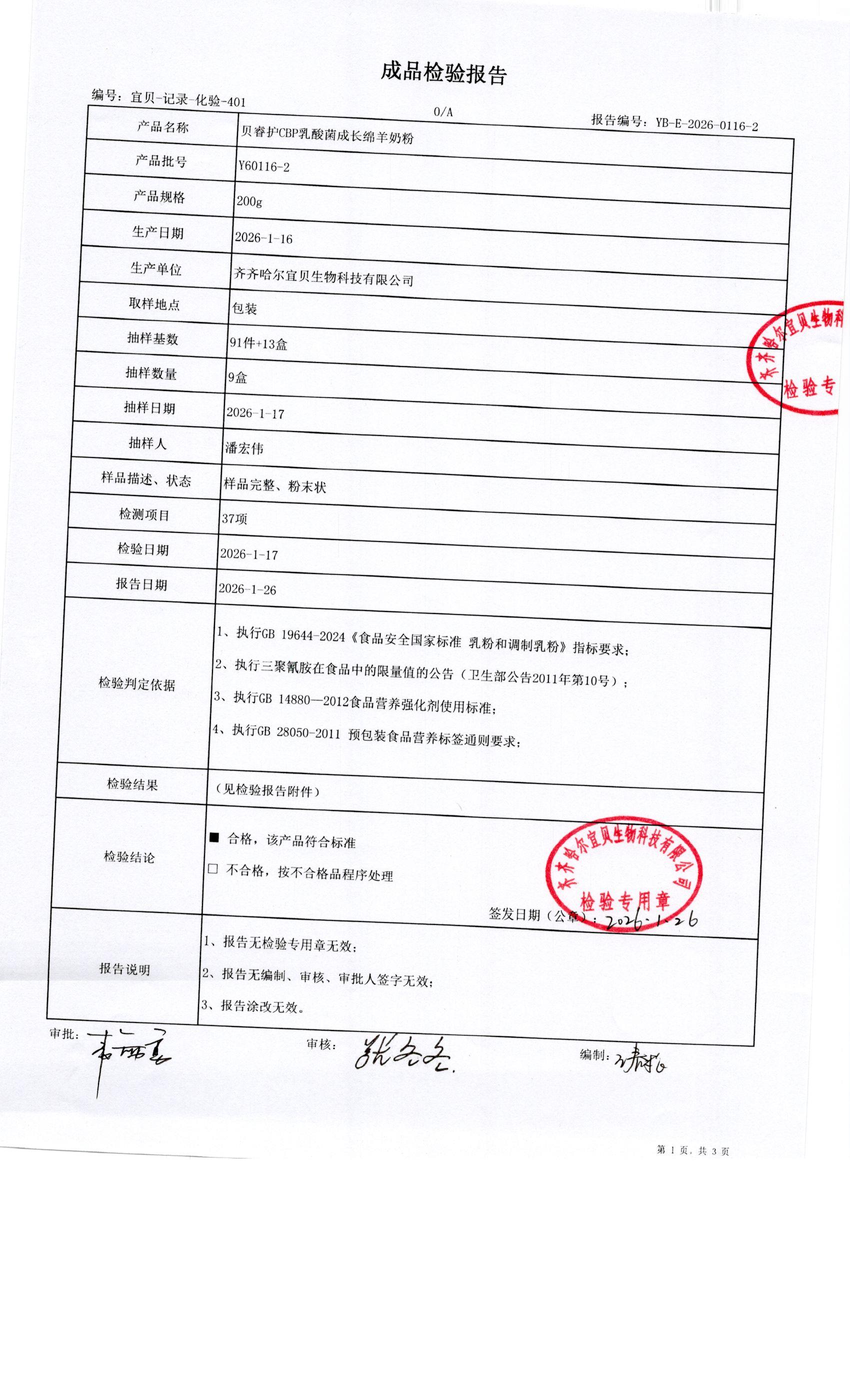 >Y60116-2贝睿护CBP乳酸菌成长绵羊奶粉200g