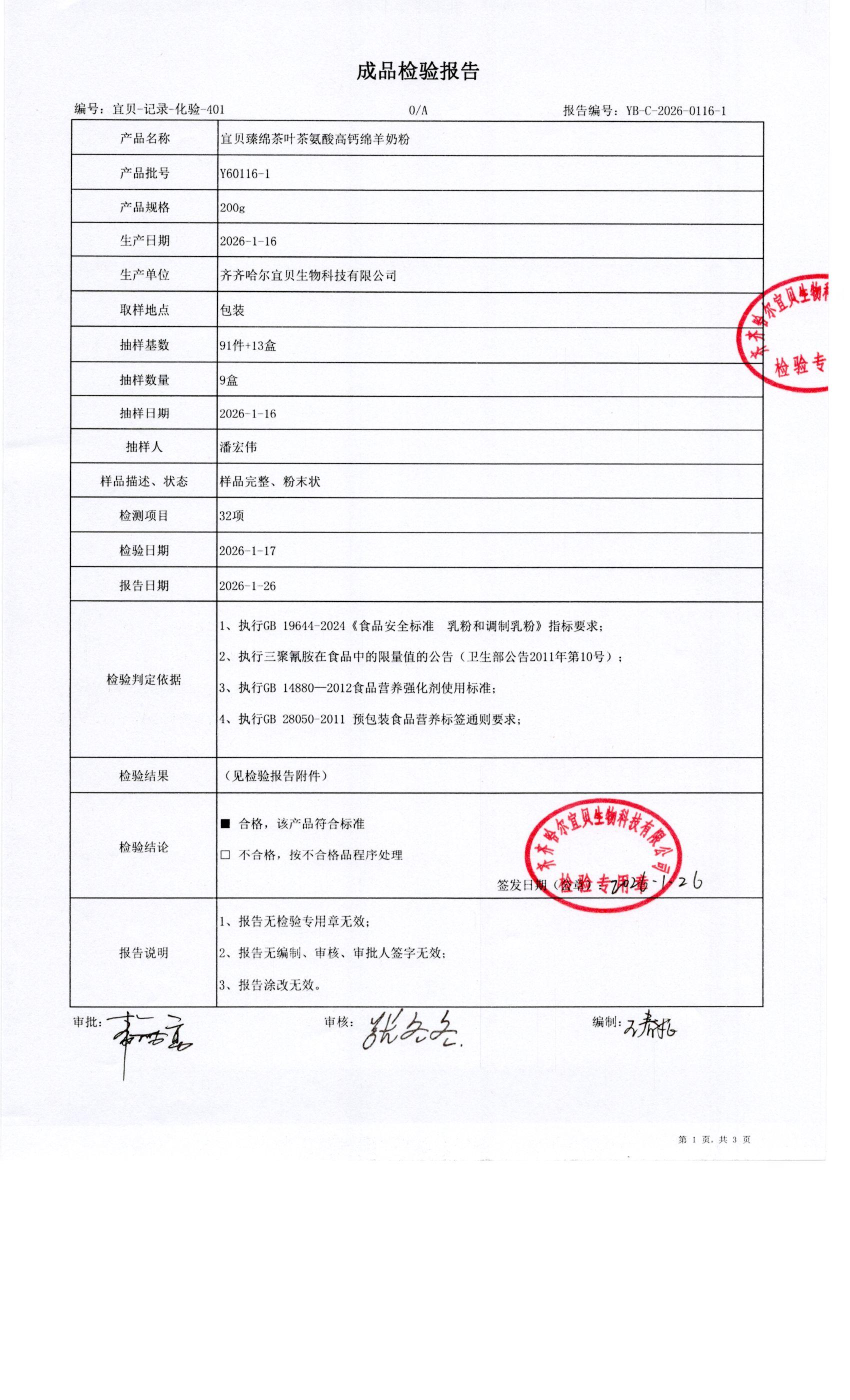 Y60116-1宜贝臻绵茶叶茶氨酸高钙绵羊奶粉200g