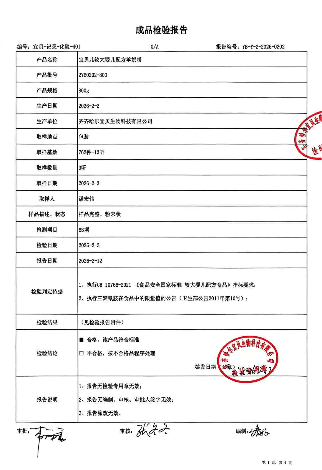>2Y60202-800宜贝儿较大婴儿配方羊奶粉800g